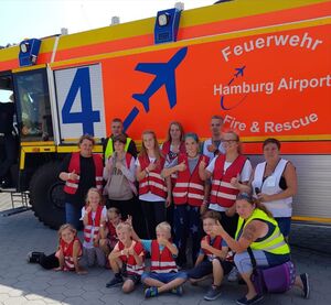 Im Vordergrund stand der Besuch der Flughafenfeuerwehr Hamburg. Neben der Besichtigung der großen Feuerwehrautos und der hochmodernen Technik wurden unsere jungen Kameraden mittels eines sehr interessanten Vortrags in die Arbeit der Hamburger Kollegen eingeführt. Ganz gespannt und aufmerksam hörten sie alle zu, als das Thema „Wie wird ein Flugzeug gelöscht“ sehr anschaulich erklärt wurde.