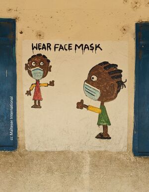 Besonders beliebt sind die kindgerechten Illustrationen, wie beispielsweise das Foto von der Tokiman Community Primary School im Ort Payam Rejaf zeigt – dort haben die Schüler*innen zur Veranschaulichung der AHA-Regeln (Abstandsregeln, korrektes Händewaschen, Husten-/Niesverhalten, Mund-Nase-Schutz) die MHF-Illustrationen an die Schulwände übertragen.